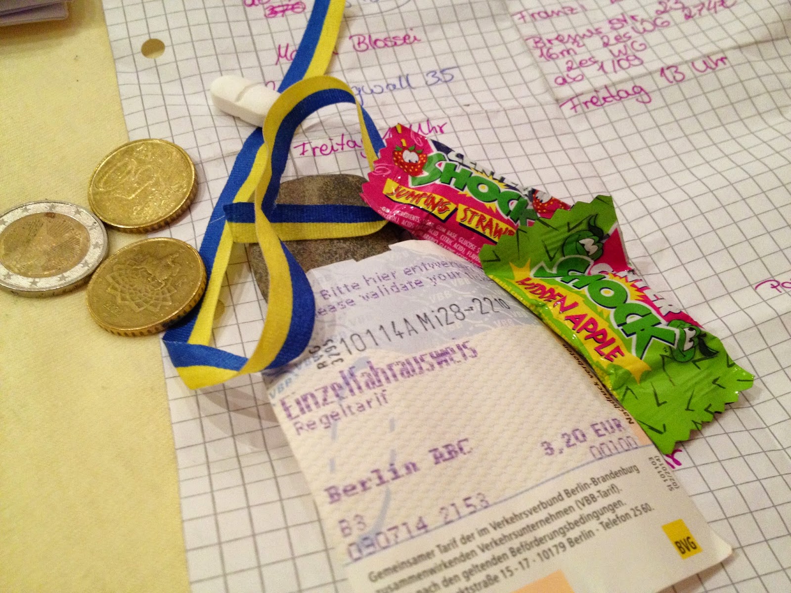 Die CenterShocks erinnern an ein faunisches Wochenende, die Fahrkarte des BVGs an eine herzliche Einladung zum Abendessen in Charlottenburg (inclusive Tjejprat) mit der anschließenden Fahrt nach Alt Schönow zu meinem Schlafplatz. Den Stein hat mir eine Freundin von ihrem Roadtrip quer durch Deutschland mitgebracht und der große Zettel vereint meine WG-Besichtigungstermin für ein Wochenende Ende August, bei der meine neue Bleibe noch gar nicht dabei war. Und last but not least die Schmerztablette, die ich mir für den Malkurs Mitte September zur Sicherheit eingepackt hatte. Der Kurs war eine Geburtstagsgeschenk meiner Schwester, bei dem ich sie begleitet habe, allerdings krank geschrieben mit Bronchitis. Das Zeichnen hat mich so selig gemacht, dass ich gar keine Schmerzen mehr hatte und die Tablette nun in den Sondermüll wandert.